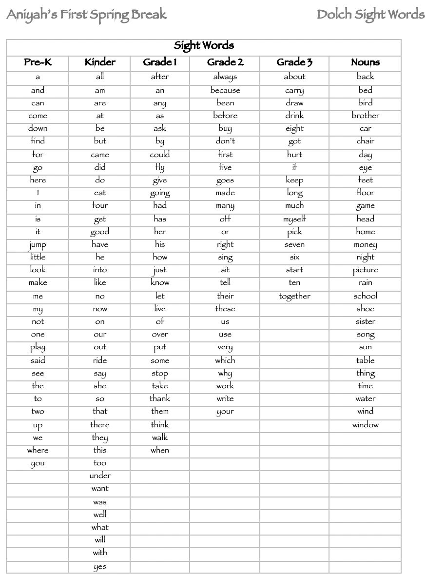The table identifies the sight words that are incorporated in Aniyah's First Spring Break.